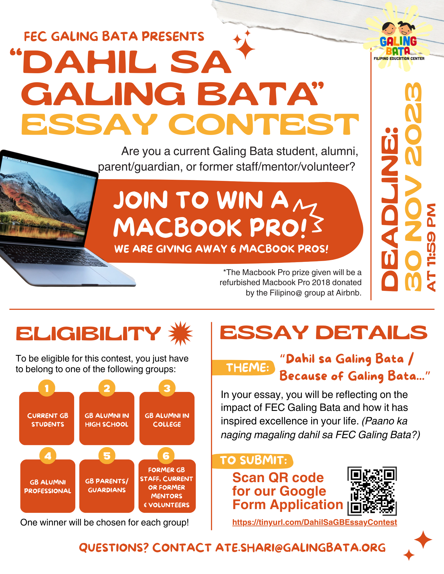 This contest reflects the impact of Galing Bata and how it has inspired excellence in your life, or in Filipino, “Paano ka naging magaling dahil sa FEC Galing Bata?”